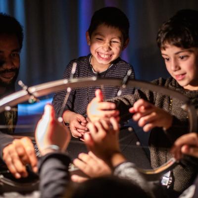 Mobile Touch is a collection of colourful instruments invented in STEIM's sound laboratory. You don't have to have years of practice to play them: a little touch is usually enough to bring these curious inventions to life. Shake the beats from the Headbanger, pull wobbly sounds from the Fingerweb, or open the Music Boxes and find out what sounds are hiding inside!